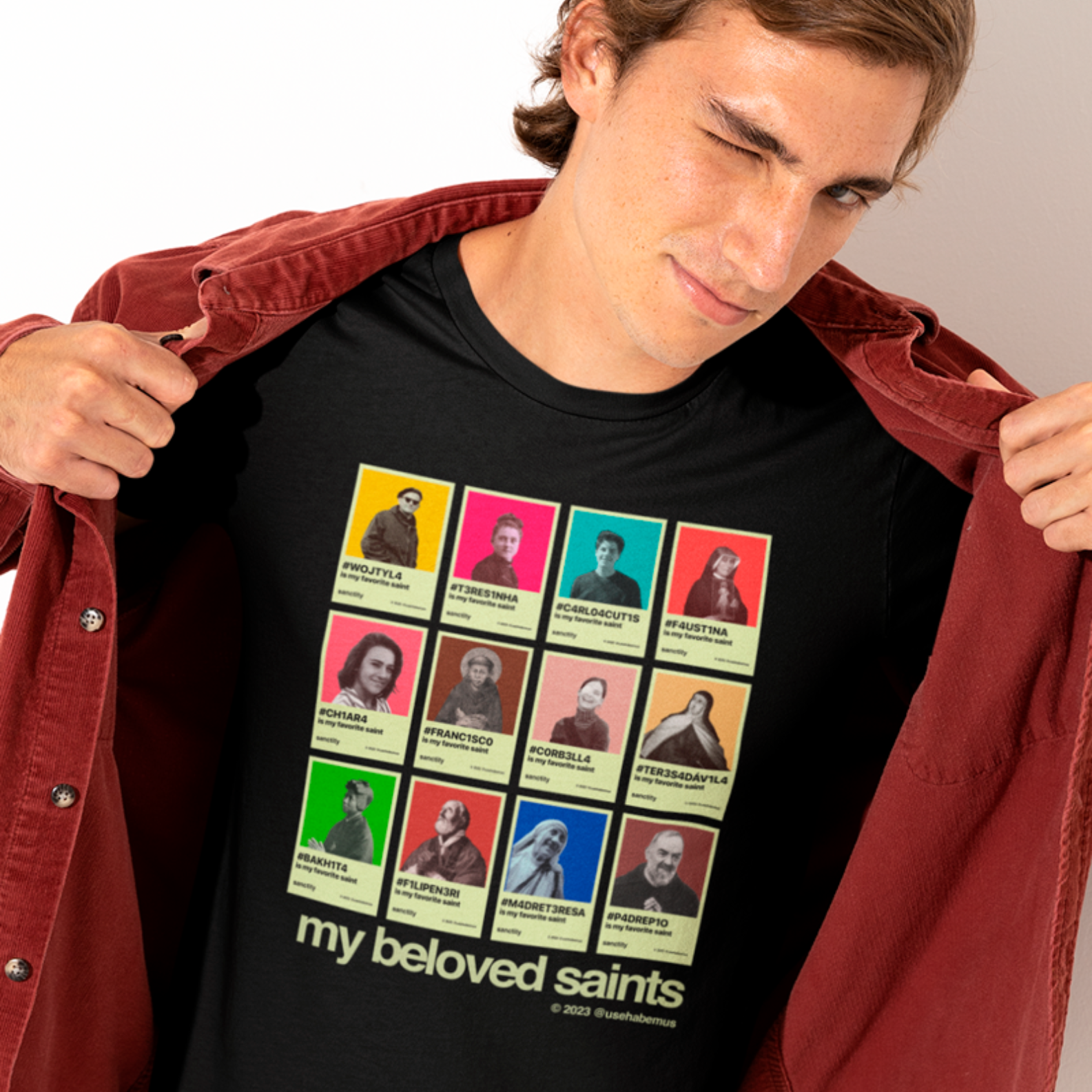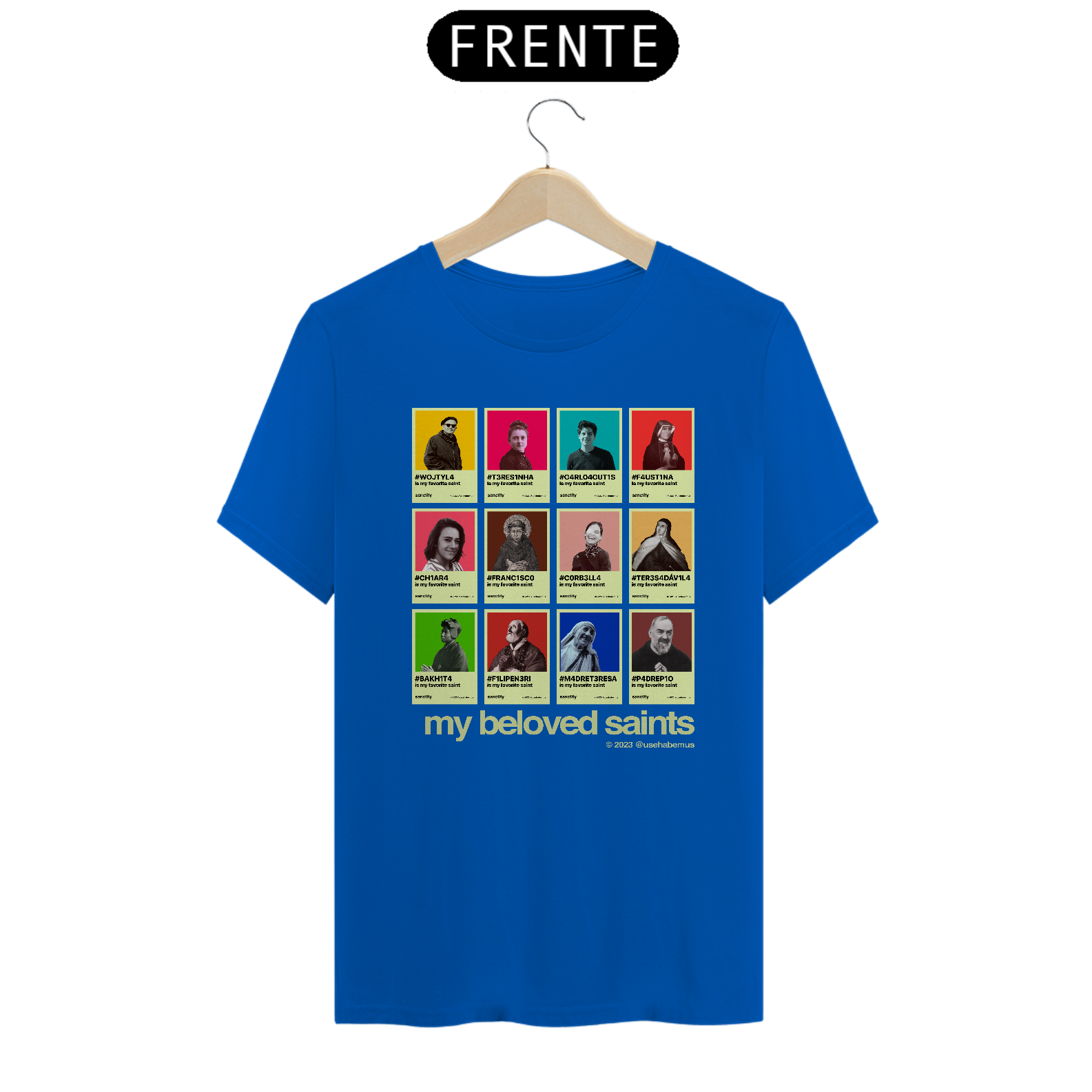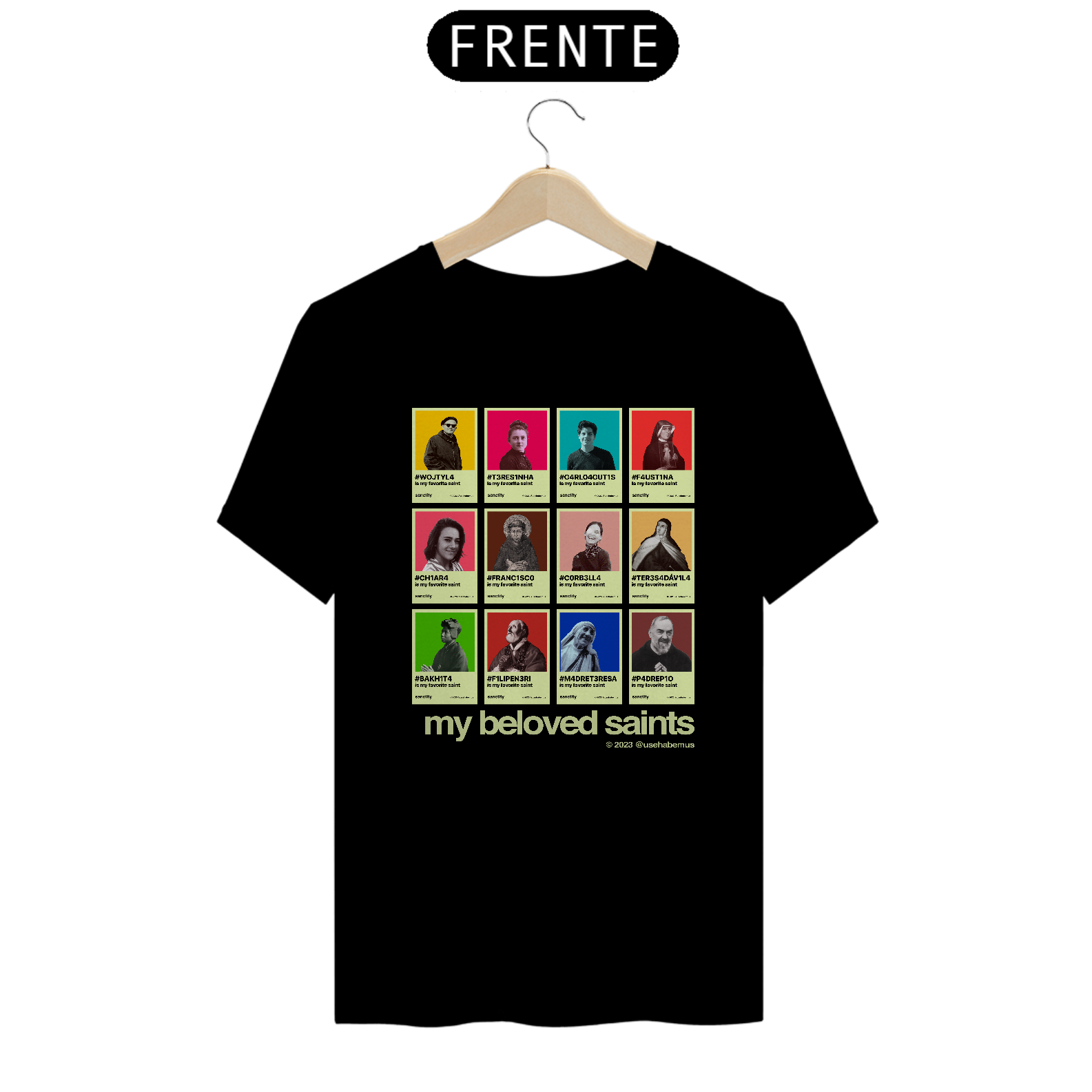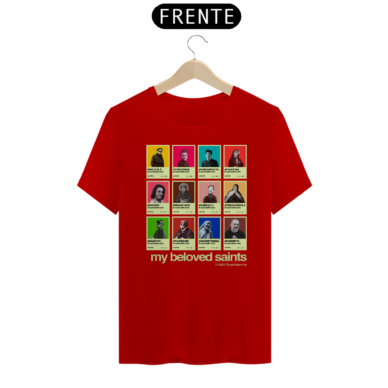 A estampa recria o visual dos perfis de redes sociais — porque esses santos não precisam de algoritmo para viralizar. Eles já mudaram o mundo antes da internet existir. E continuam mudando.